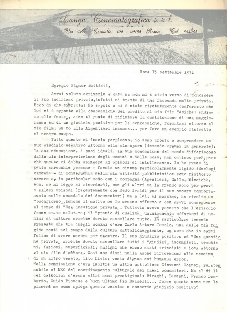 Lettera di Giorgio Trentin, della Langa Cinematografica srl, a Silvano Battisti