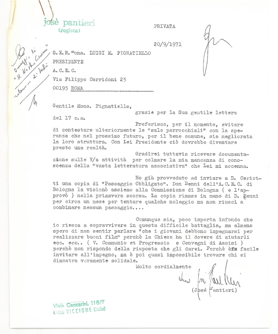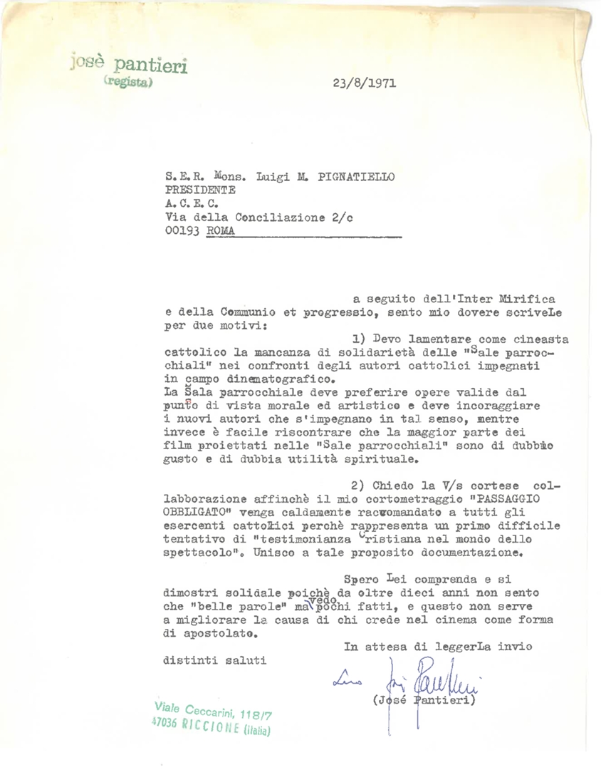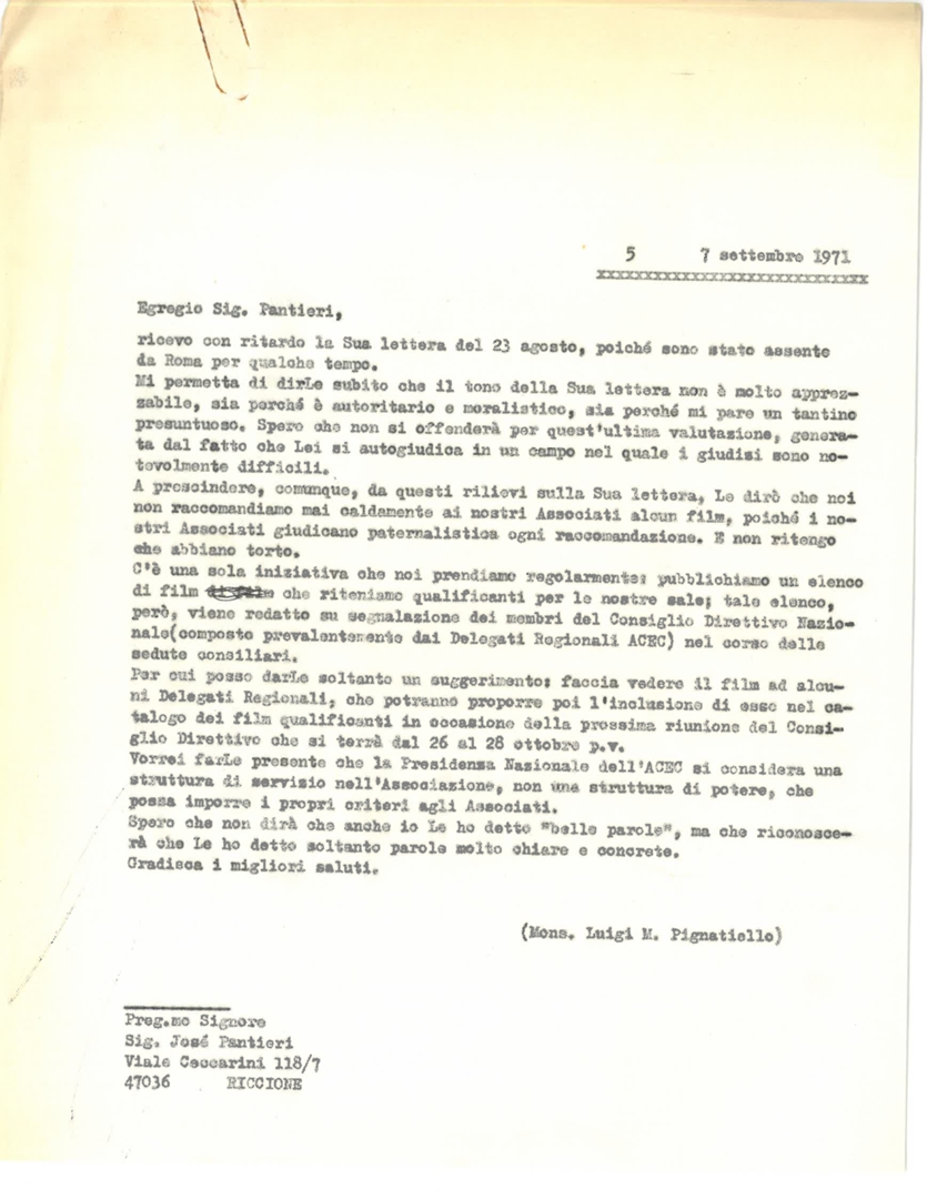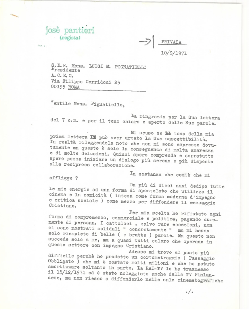 Lettera di mons. Luigi Pignatiello, presidente dell'ACEC, a José Pantieri, regista e storico del cinema italiano