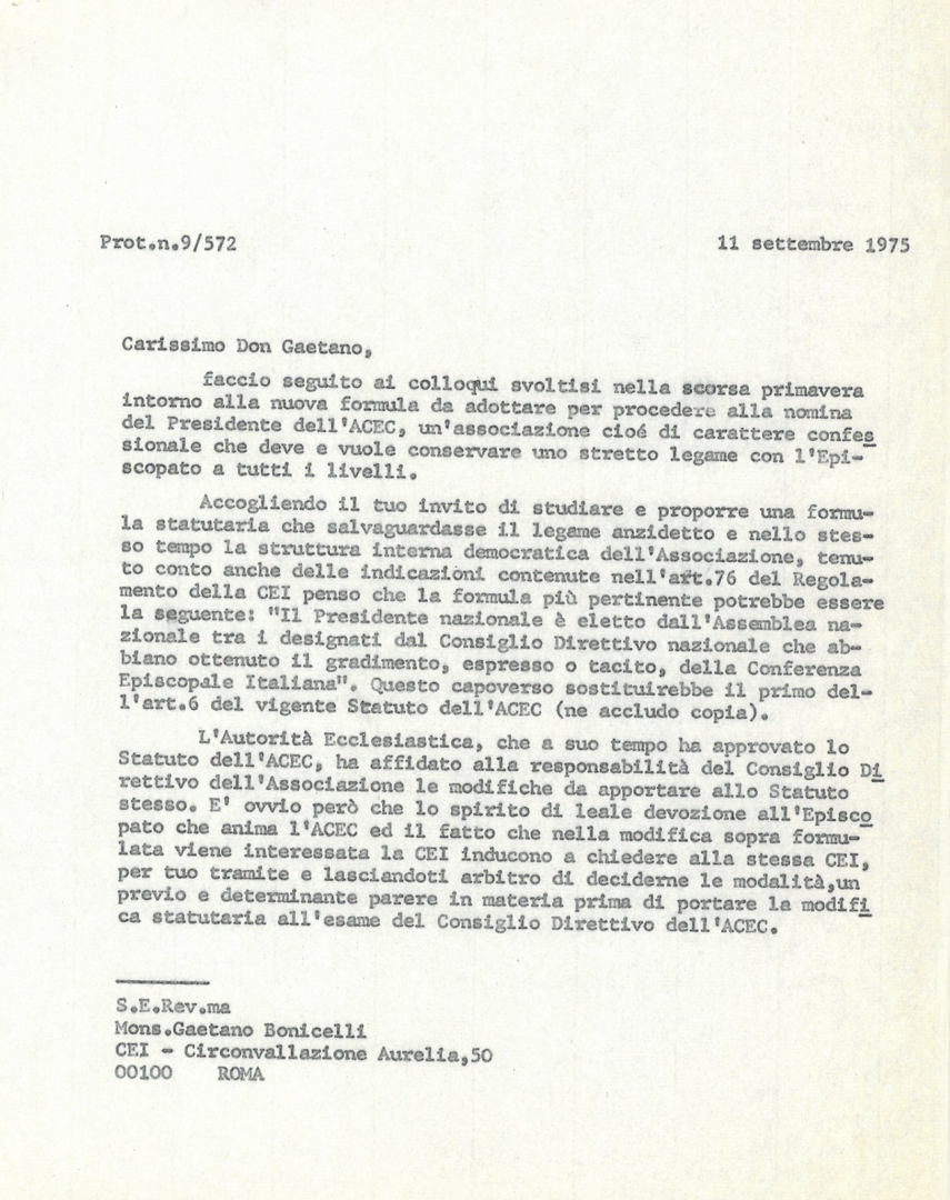 Lettera di mons. Luigi Pignatiello, presidente dell'ACEC, a mons. Gaetano Bonicelli della Conferenza episcopale italiana - CEI