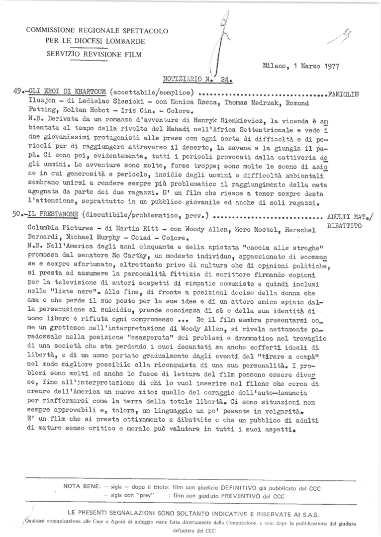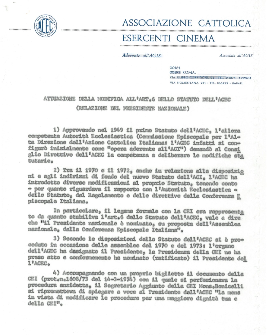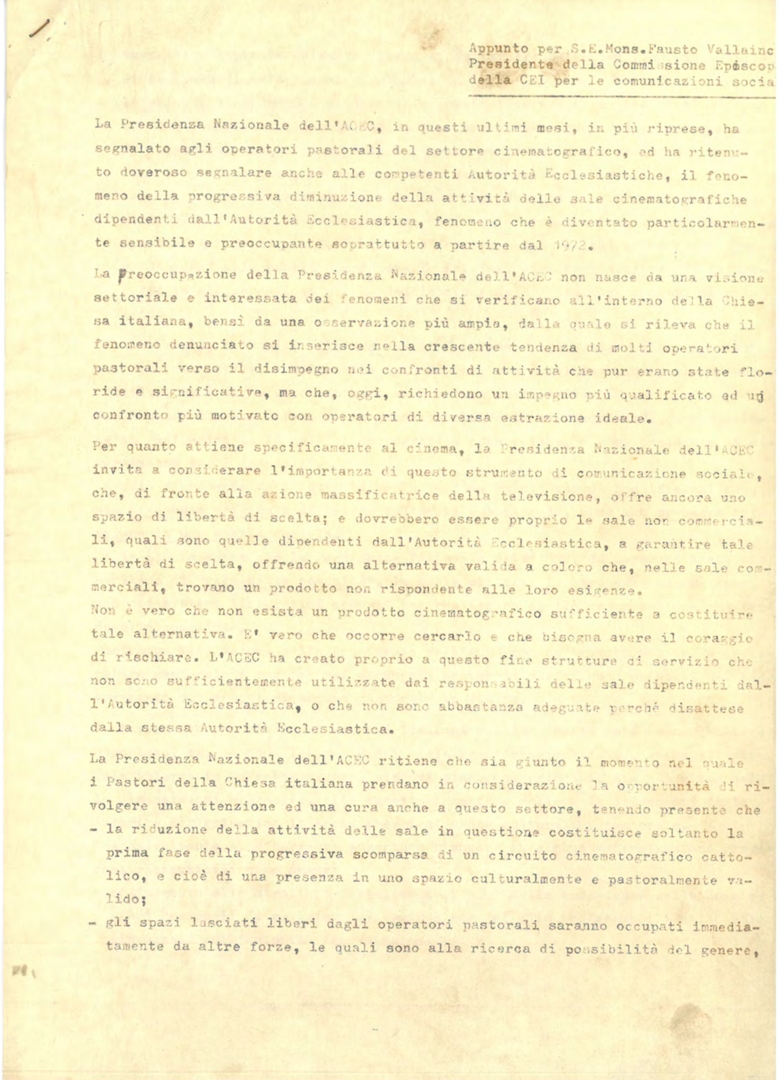 "Appunti per l'incontro con la Commissione Episcopale per le Comunicazioni Sociali del 24 febbraio 1977", a cura di mons. Luigi Pignatiello, delegato diocesano e regionale dell'ACEC (Associazione cattolica esercenti cinema) e poi vice-presidente e presidente nazionale della stessa associazione