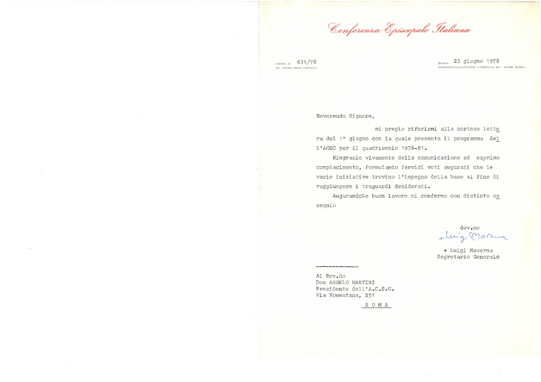 Lettera di Luigi Maverna, segretario generale della Conferenza episcopale italiana - CEI, a don Angelo Martini, presidente dell'ACEC