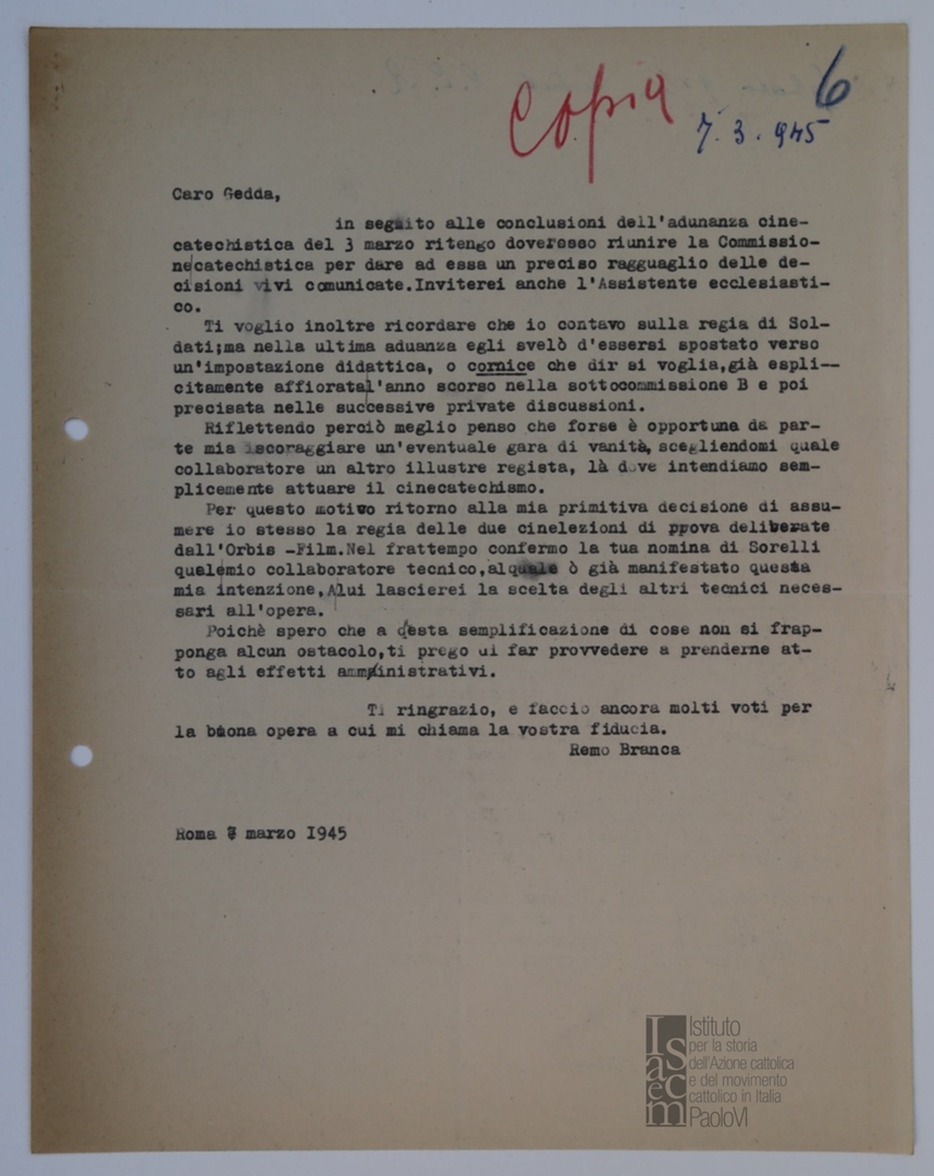 Lettera di Remo Branca a Luigi Gedda, presidente del Centro cattolico cinematografico - CCC