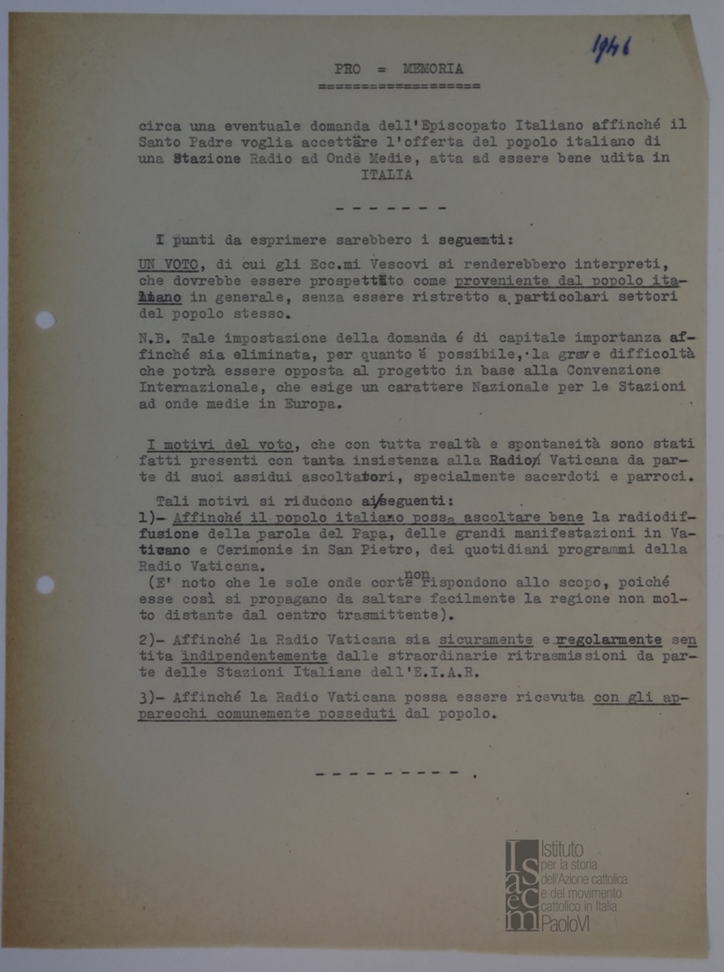 "Pro memoria circa una eventuale domanda dell'Episcopato italiano affinché il Santo Padre voglia accettare l'offerta del popolo italiano di una stazione radio ad onde medie atta ad essere bene udita in Italia"