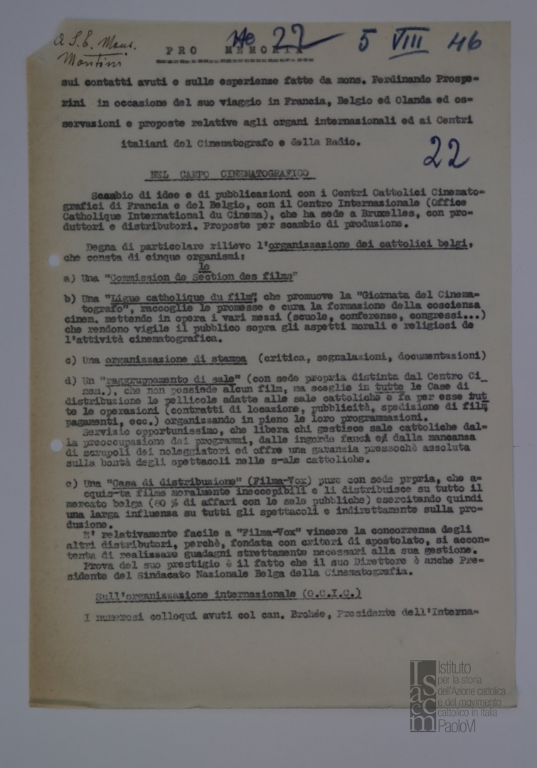 "Pro memoria sui contatti avuti e sulle esperienze fatte da mons. Ferdinando Prosperini in occasione del suo viaggio in Francia, Belgio ed Olanda, ed osservazioni e proposte relative agli organi internazionali ed ai centri italiani del cinematografo e della radio"