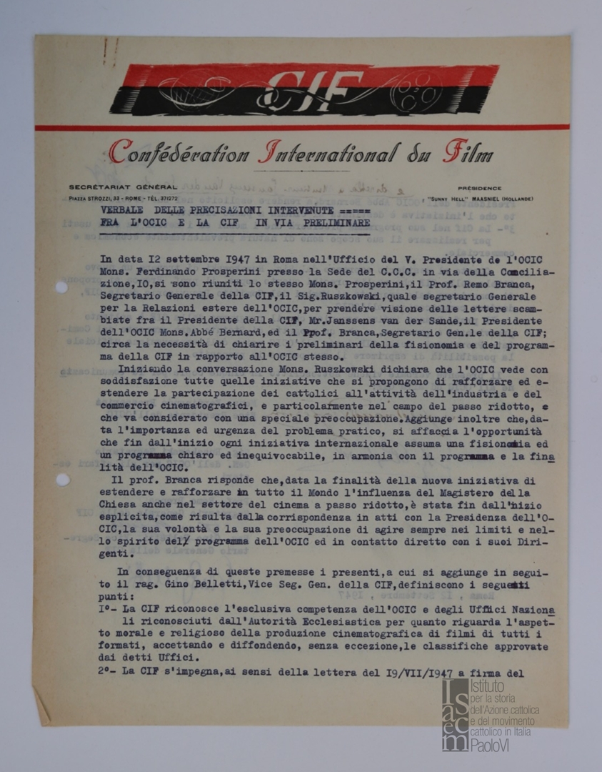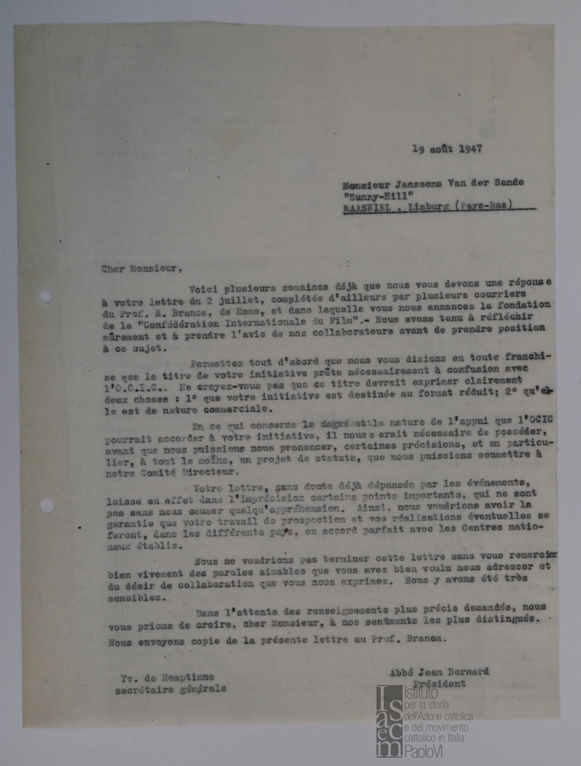 Lettera di Jean Bernard, presidente de l'Office catholique international du cinéma - OCIC, a mons. Ferdinando Prosperini, consulente ecclesiastico dell'Ente dello spettacolo