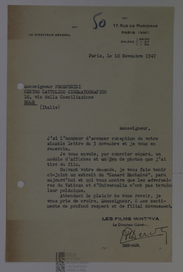 Lettera di Raymond Dervaux, direttore generale della Minerva Film, a Ferdinando Prosperini, consulente ecclesiastico dell'Ente dello spettacolo
