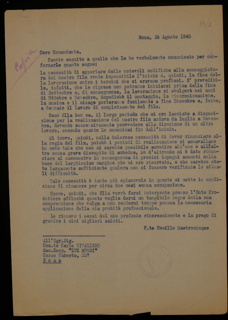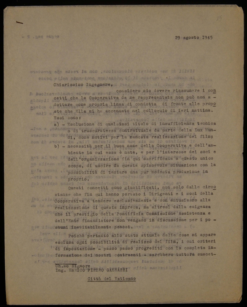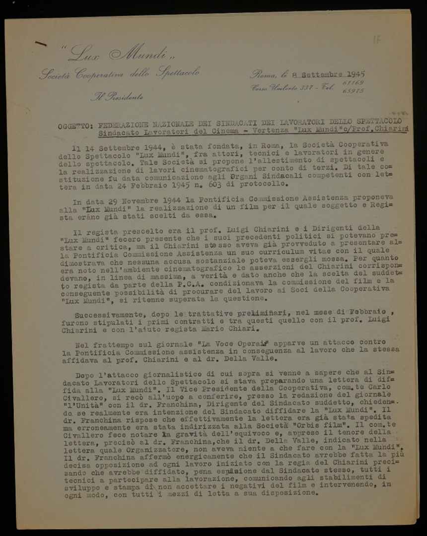 Lettera del sindacato lavoratori del cinema, a firma del segretario Guido Berardelli e di Basilio Franchina, alla Lux Mundi