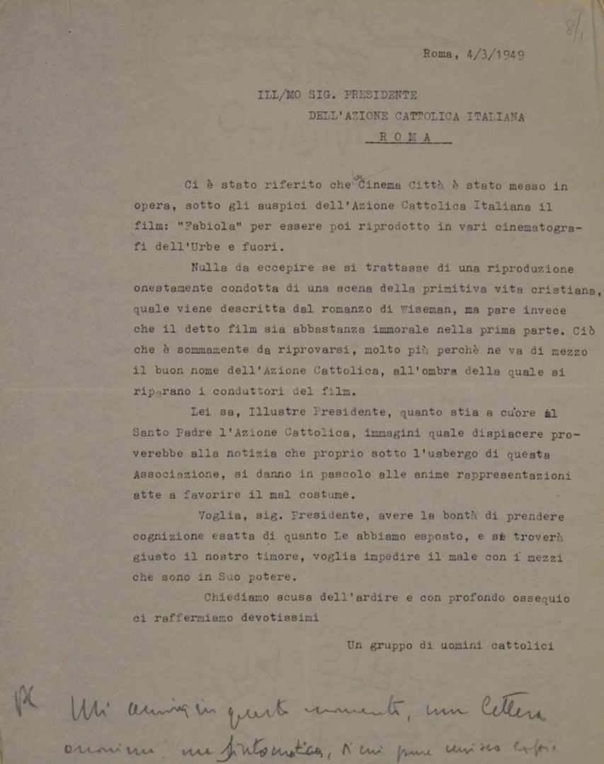Lettera firmata "un gruppo di uomini cattolici" a Vittorino Veronese, presidente generale dell'ACI