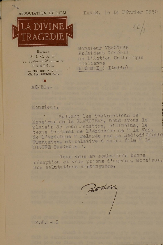 Lettera su carta intestata Association du film "La Divine Tragedie" indirizzata a Vittorino Veronese, presidente generale dell'ACI