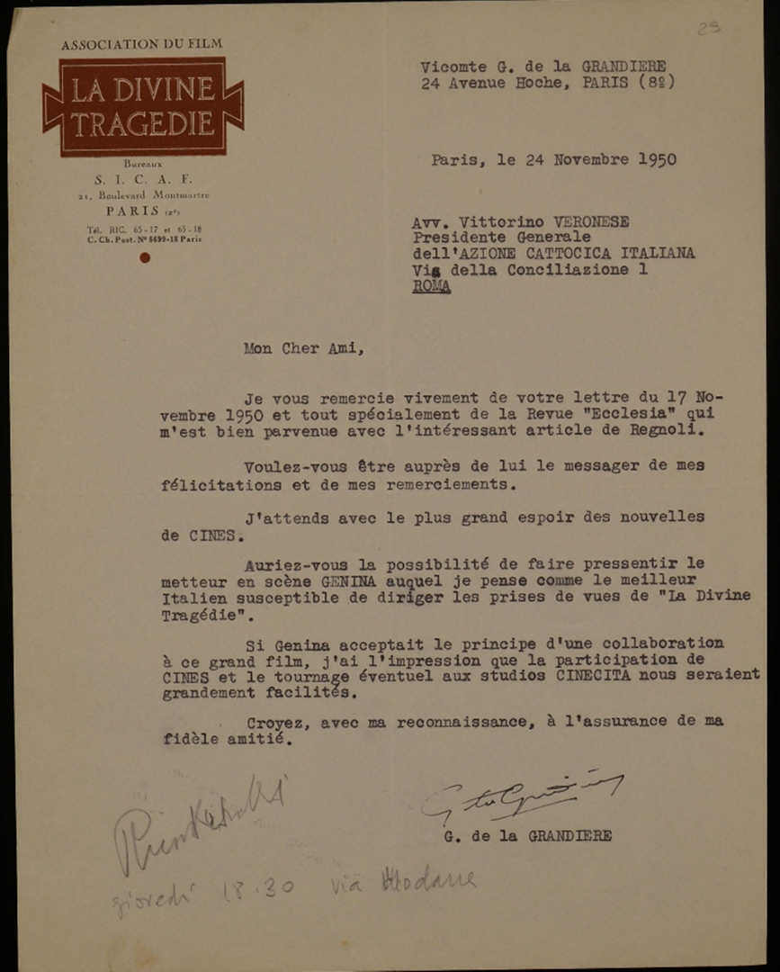 Lettera di Vittorino Veronese, presidente generale dell'ACI, a Georges de la Grandiere