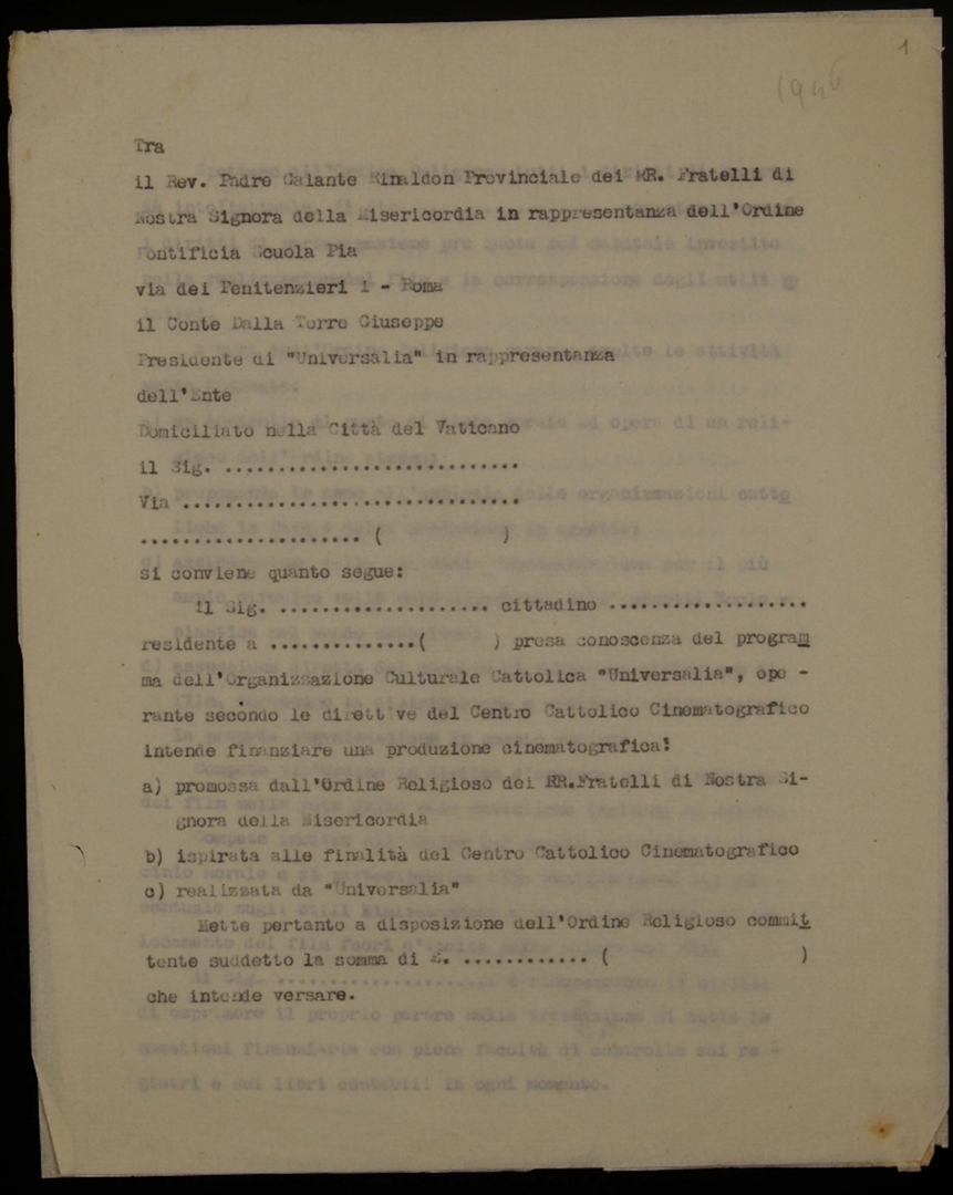 Bozza di convenzione tra la casa di produzione Universalia, presieduta da Giuseppe Dalla Torre, e l'Ordine religioso Pontificia Scuola Pia, rappresentato da padre Rinaldo Galante, per il finanziamento di un'opera cinematografica