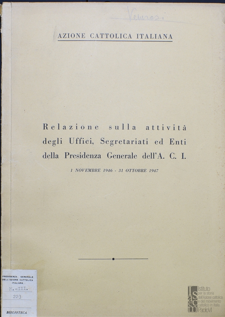 "Relazioni sull'attività degli uffici, segretariati ed enti della Presidenza generale dell'ACI - 1 novembre 1946-31 ottobre 1947"
