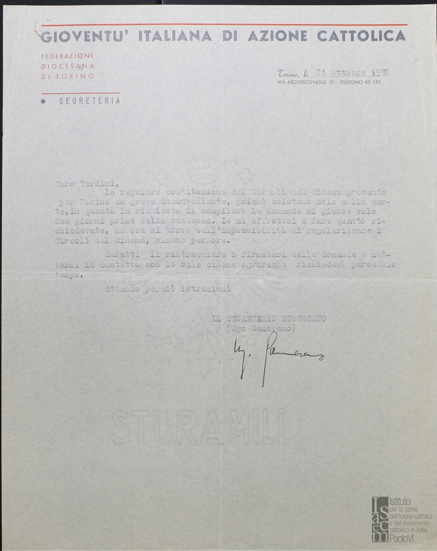 Lettera del segretario diocesano di Torino, Ugo Camerano, sulla costituzione dei Circoli del cinema