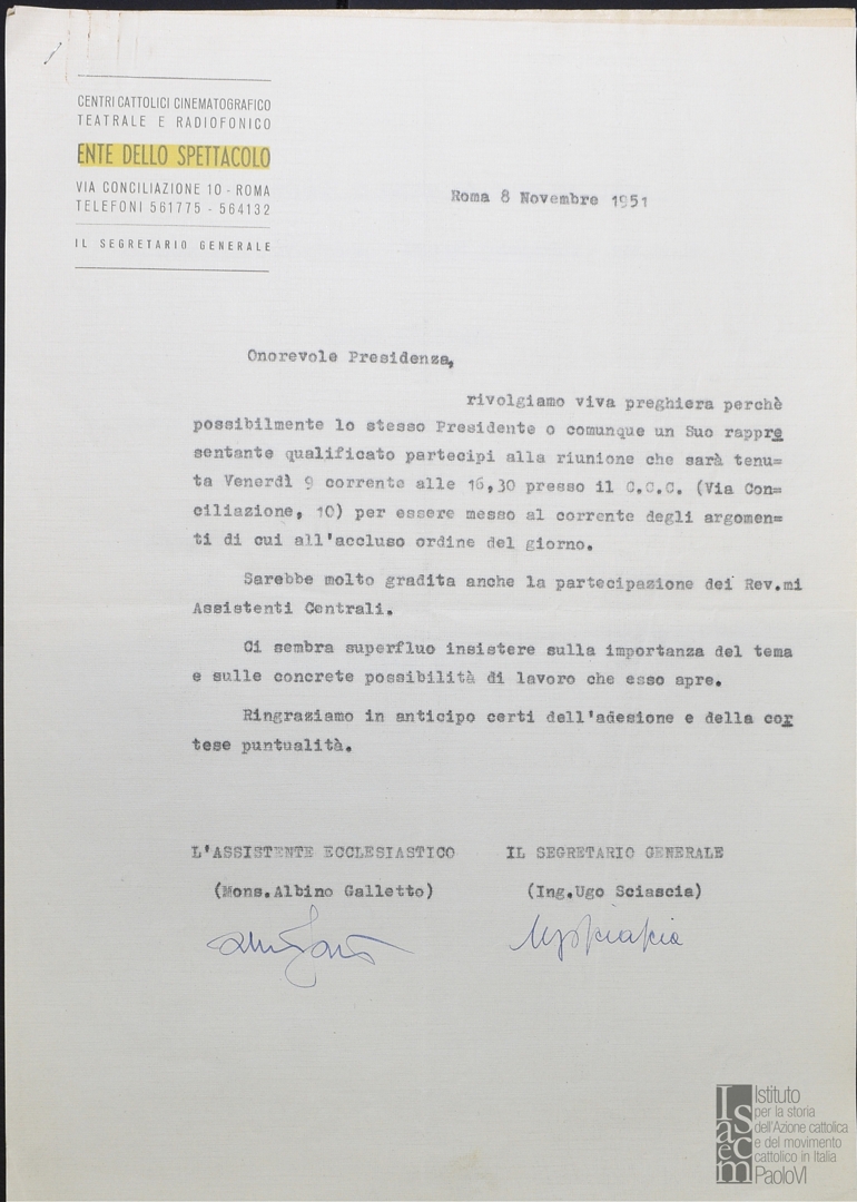 Incontro presso il Centro cattolico cinematografico, 9 novembre 1951