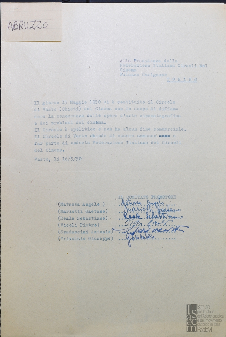 Lettera di Albino Galletto, consulente ecclesiastico dell'Ente dello spettacolo a Carlo Carretto, presidente della GIAC