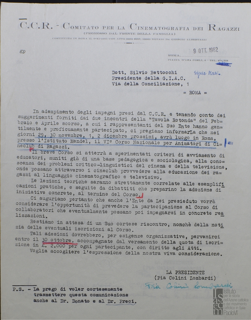 Comitato per la cinematografia per ragazzi. Comunicazioni della presidente, Pia Colini Lombardi