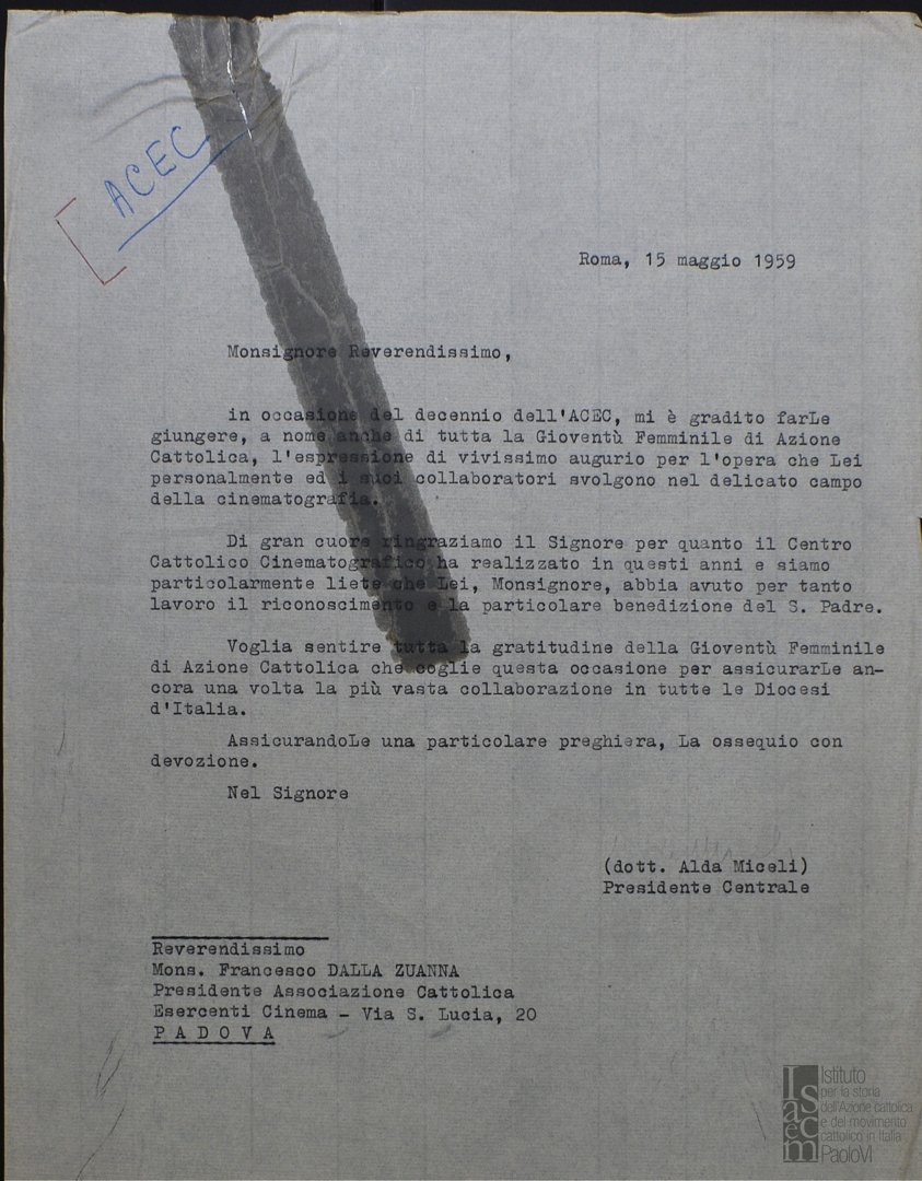 Lettera di Giovanni XXIII a Francesco Dalla Zuanna per il decennio dell'ACEC