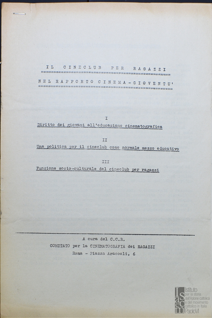 Giornate di studio "Esercizio cinematografico cattolico e lo spettatore ragazzo e adolescente"