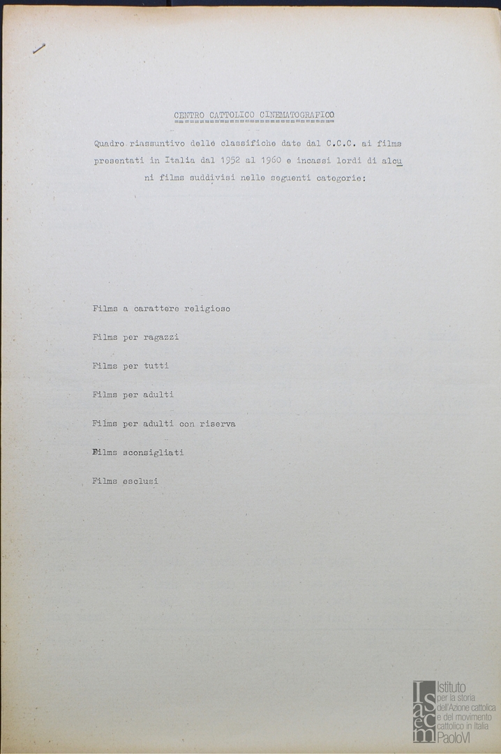 "Quadro riassuntivo delle classifiche date dal CCC ai films presentati in Italia dal 1952 al 1960 [...]"