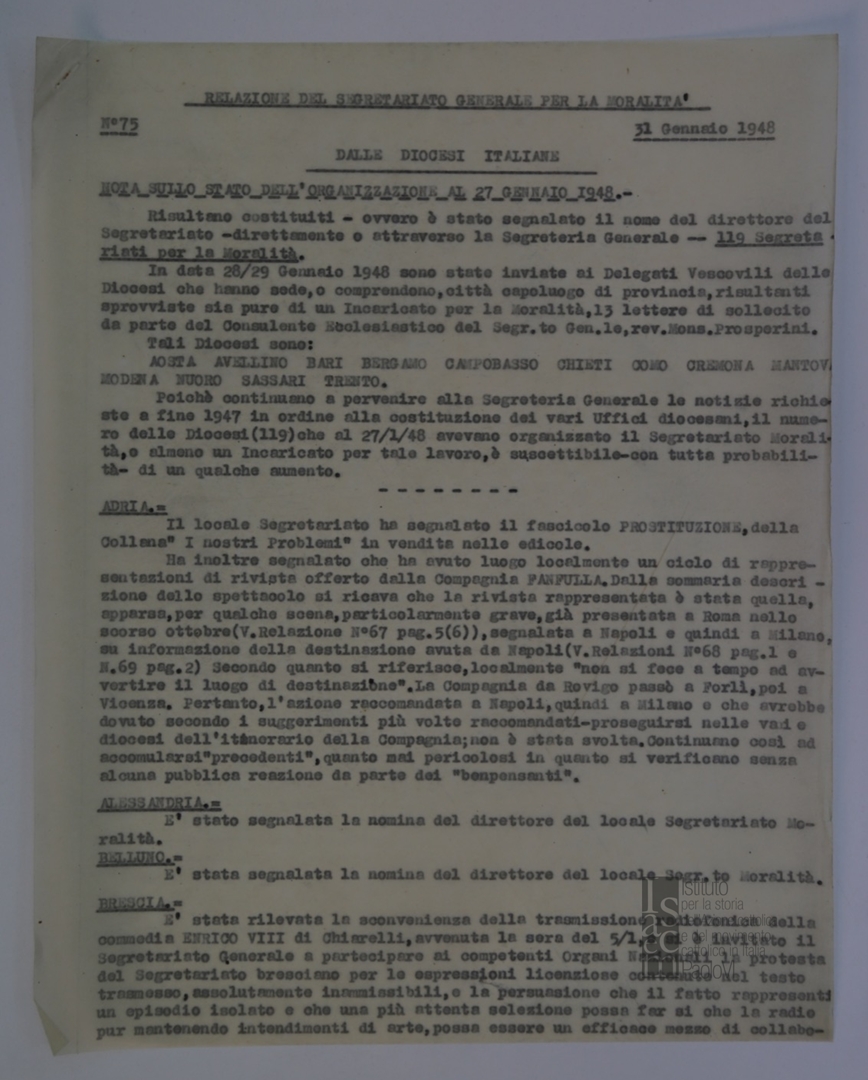 "Relazione del Segretariato Generale per la Moralità. Nr. 75"