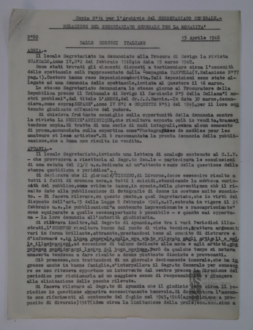 "Relazione del Segretariato Generale per la Moralità. Nr. 80"