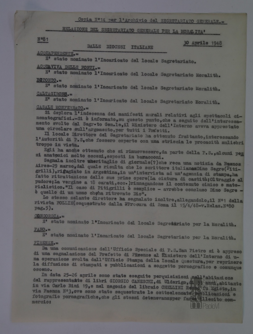 "Relazione del Segretariato Generale per la Moralità. Nr. 81"