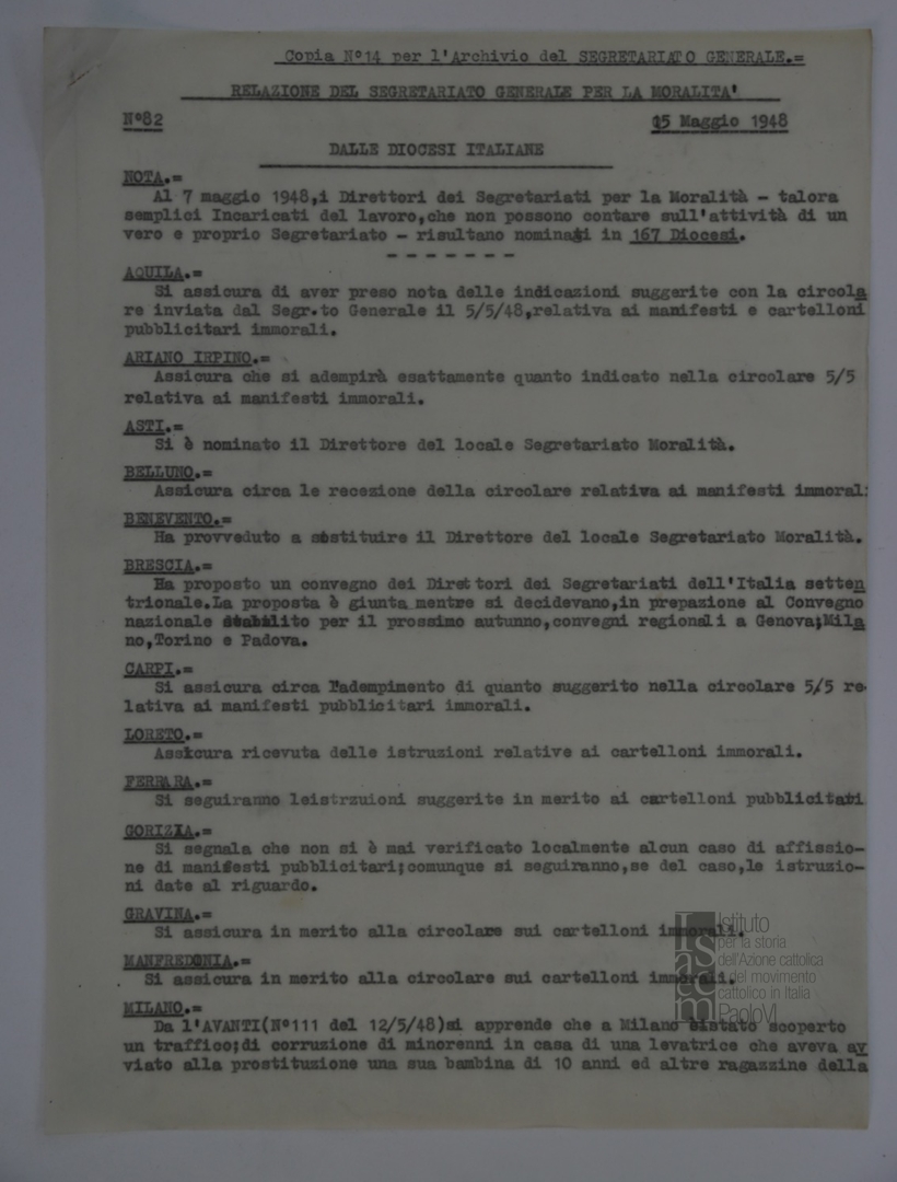 "Relazione del Segretariato Generale per la Moralità. Nr. 82"
