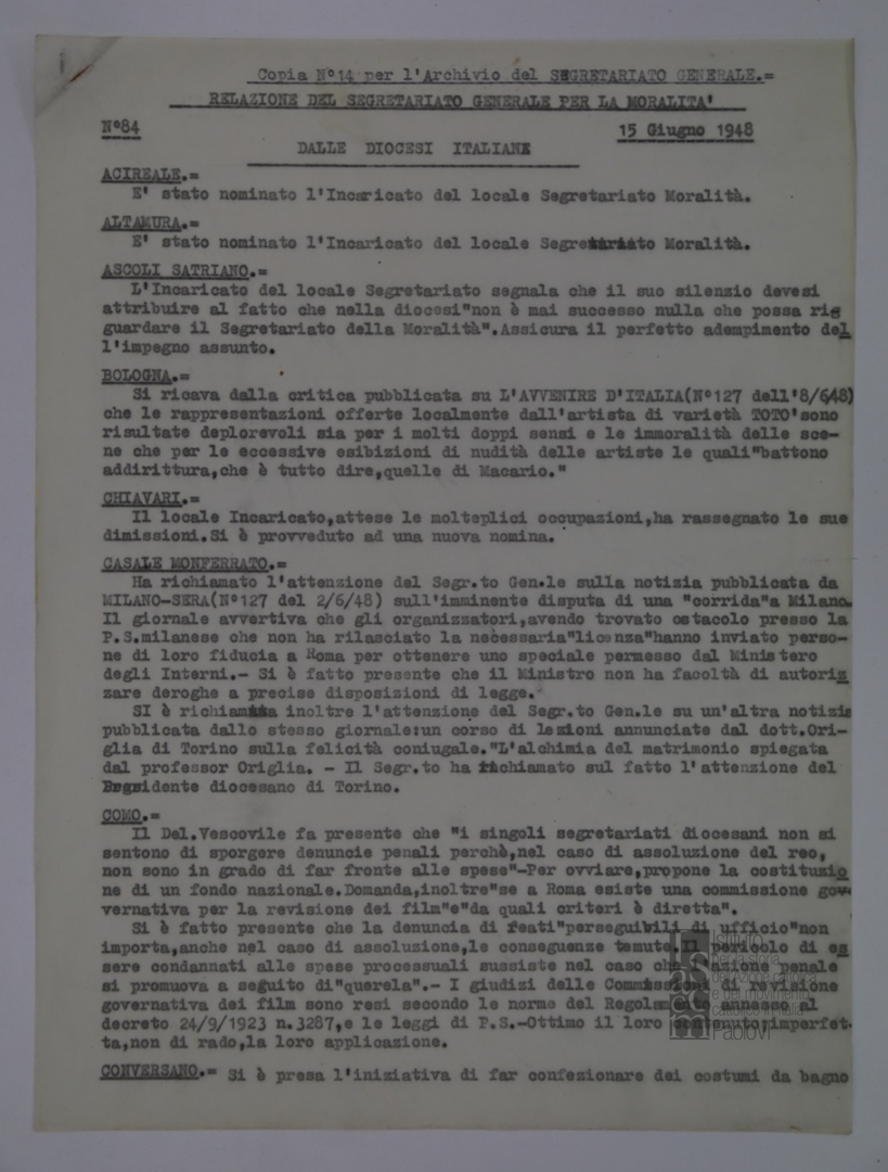 "Relazione del Segretariato Generale per la Moralità. Nr. 84"