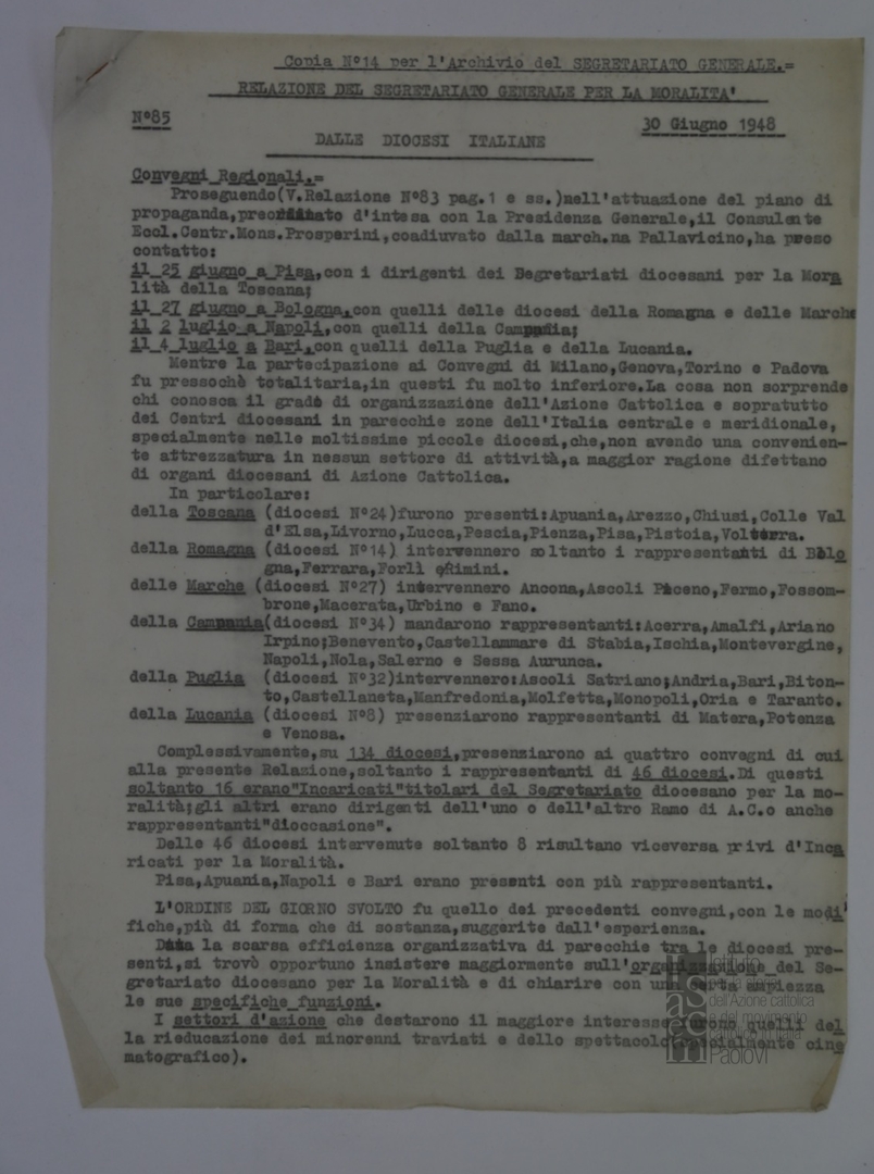 "Relazione del Segretariato Generale per la Moralità. Nr. 85"