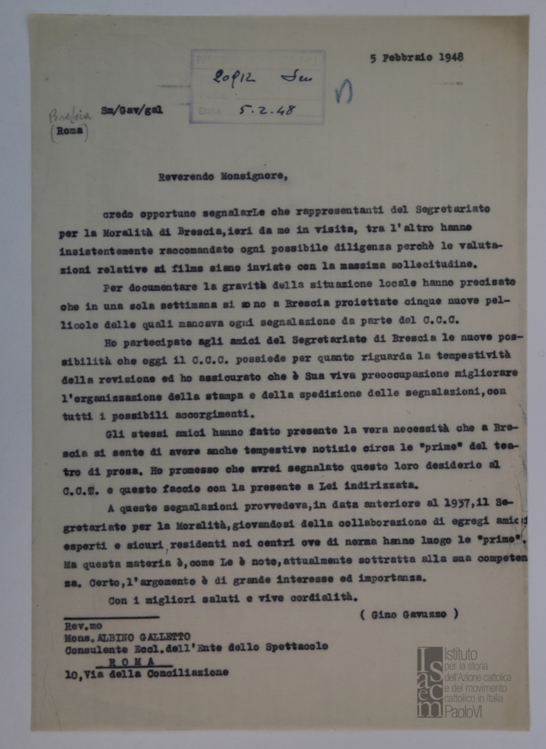 Lettera di Gino Gavuzzo a mons. Albino Galletto, consulente ecclesiastico dell'Ente dello spettacolo