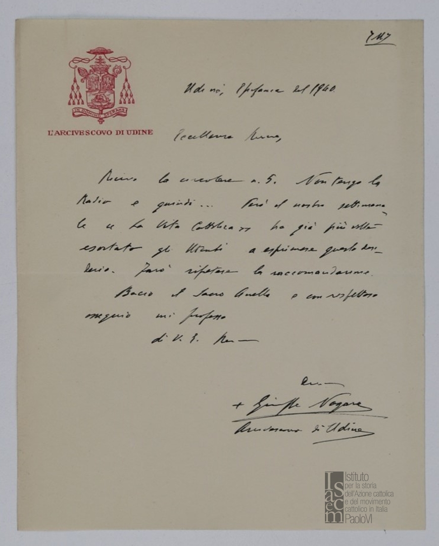 Lettera di mons. Giuseppe Nogara, arcivescovo di Udine, a mons. Evasio Colli, vescovo di Parma e direttore generale dell'ACI