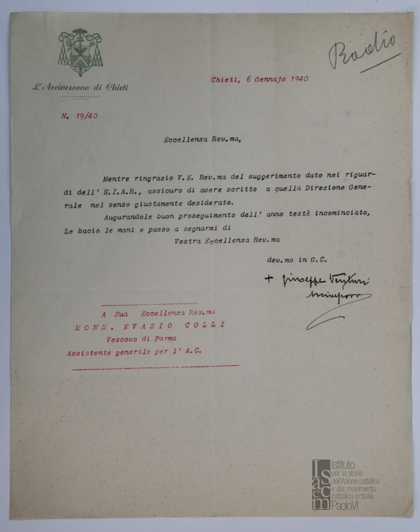 Lettera di mons. Giuseppe Venturi, arcivescovo di Chieti, a mons. Evasio Colli, vescovo di Parma e direttore generale dell'ACI