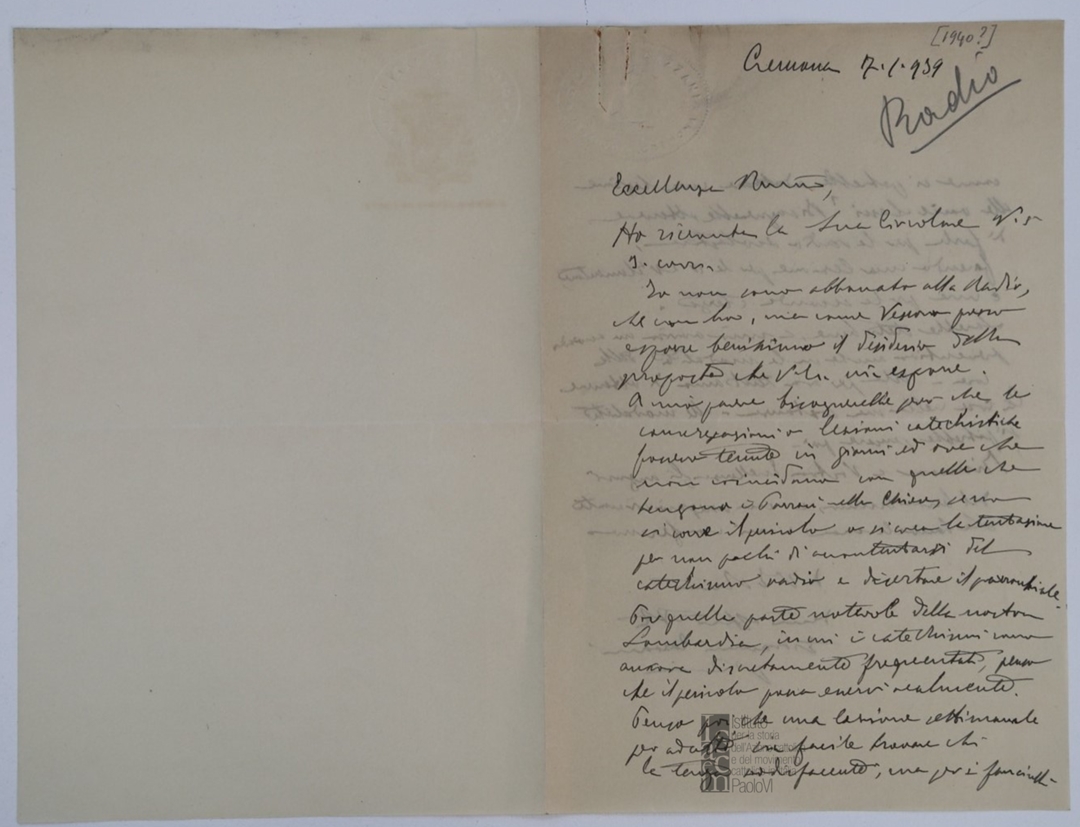 Lettera di mons. Giovanni Cassani , arcivescovo di Cremona, a mons. Evasio Colli, vescovo di Parma e direttore generale dell'ACI