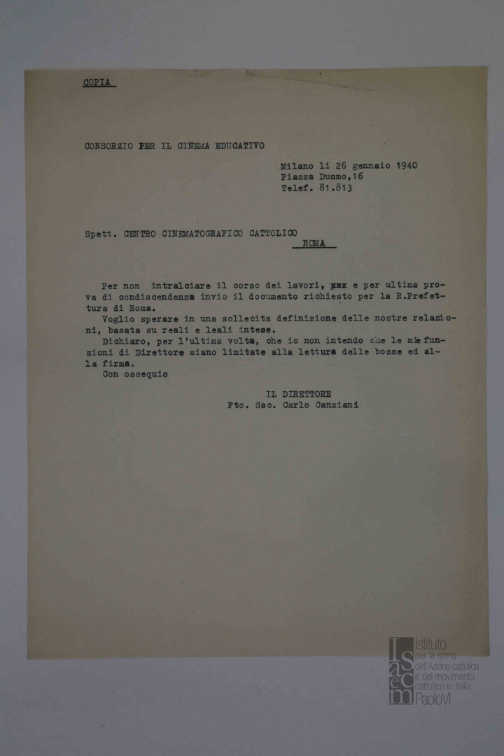 Lettera di don Carlo Canziani, direttore del Consorzio per il cinema educativo - CCE, al Centro cattolico cinematografico - CCC