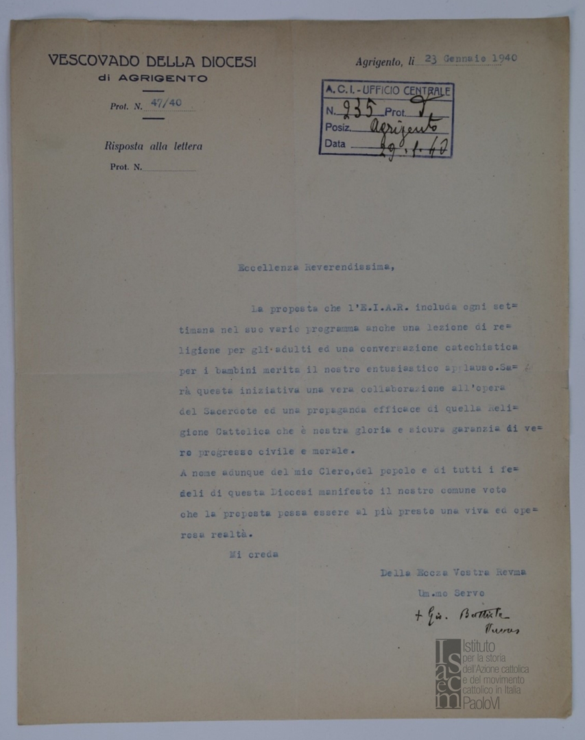 Lettera di mons. Giovanni Battista Peruzzo, vescovo di Agrigento, a mons. Evasio Colli, vescovo di Parma e direttore generale dell'ACI