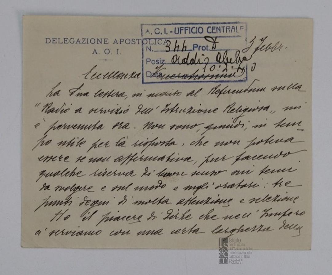 Lettera a firma del delegato apostolico per l'Africa Orientale Italiana - AOI a mons. Evasio Colli, vescovo di Parma e direttore generale dell'ACI