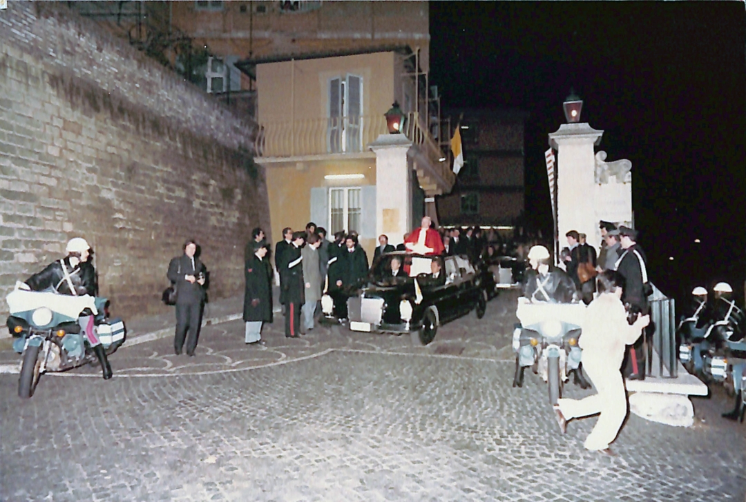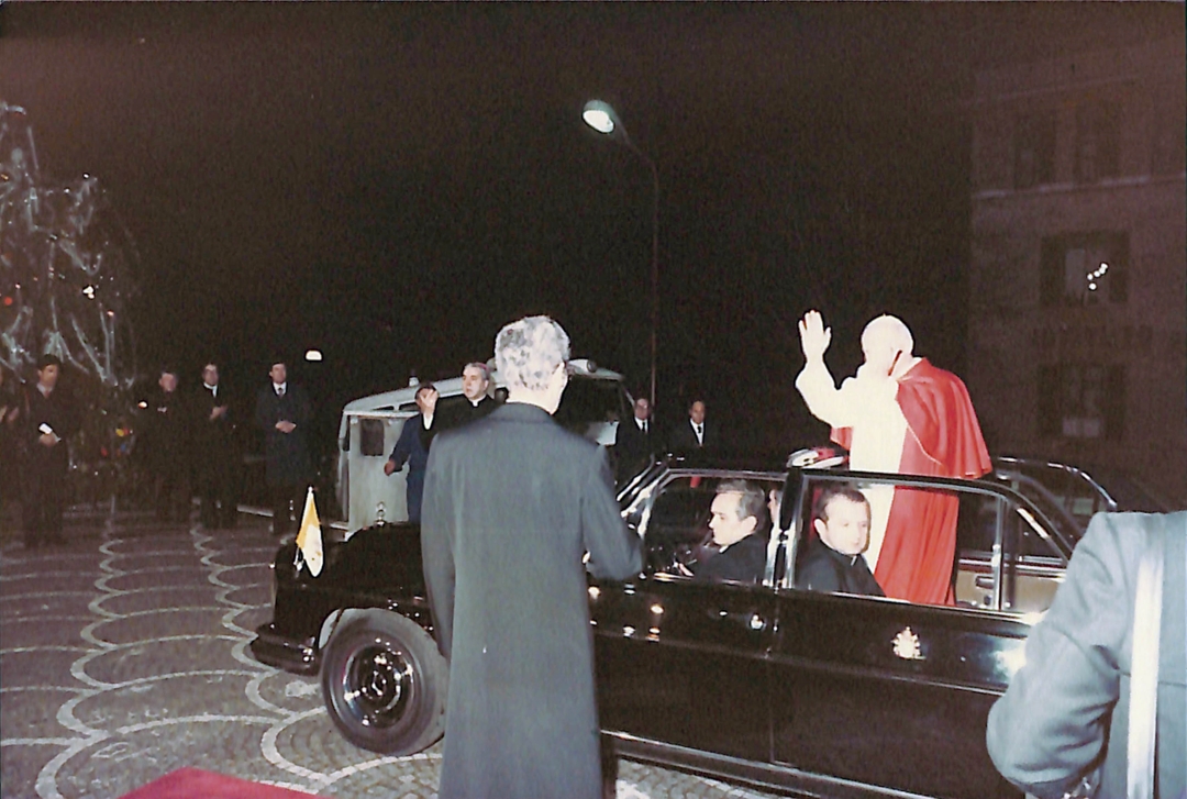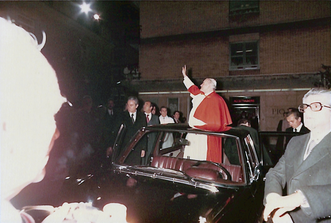 Giovanni Paolo II, a bordo della Mercedes SCV1, saluta la folla affacciata alle finestre del Padiglione Sant'Onofrio prima di lasciare l'Ospedale