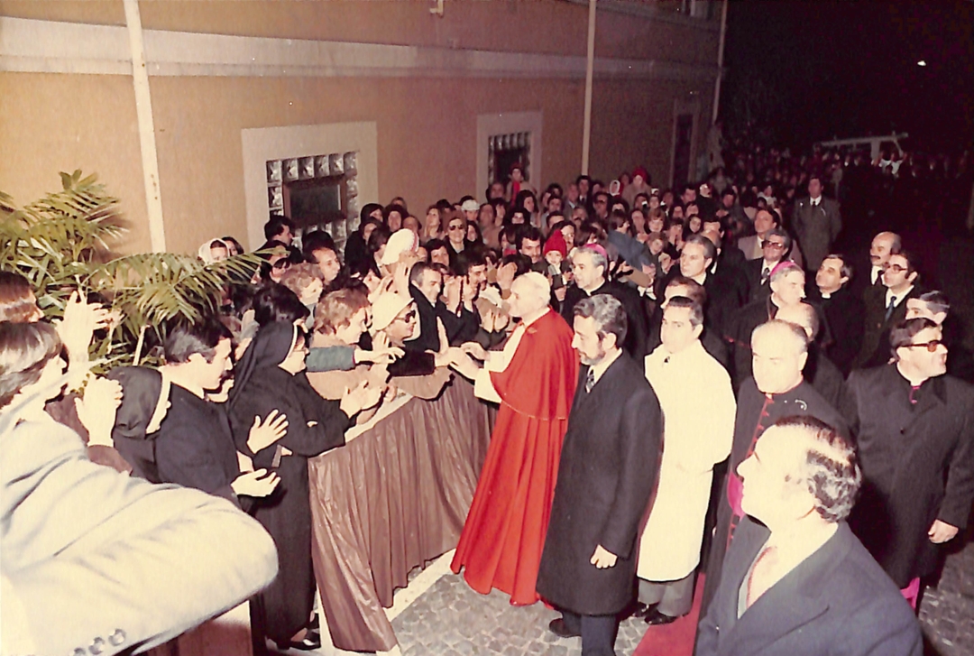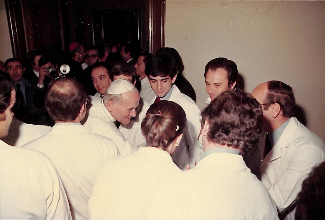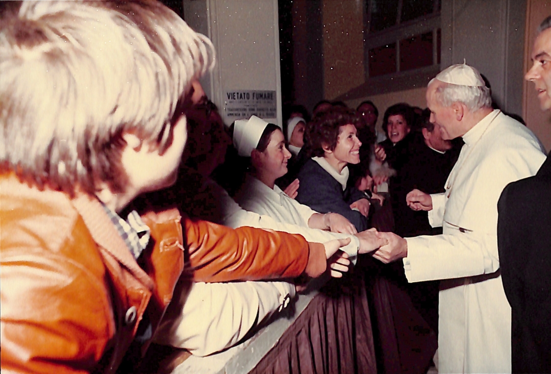 Giovanni Paolo II saluta il personale dell'ospedale convenuto all'interno dell'Aula Magna della Scuola Vigilatrici