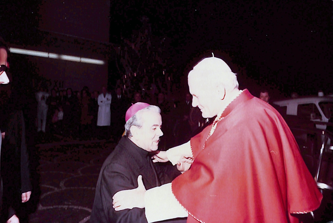 Giovanni Paolo II saluta monsignor Fiorenzo Angelini al momento di lasciare l'Ospedale al termine della sua visita