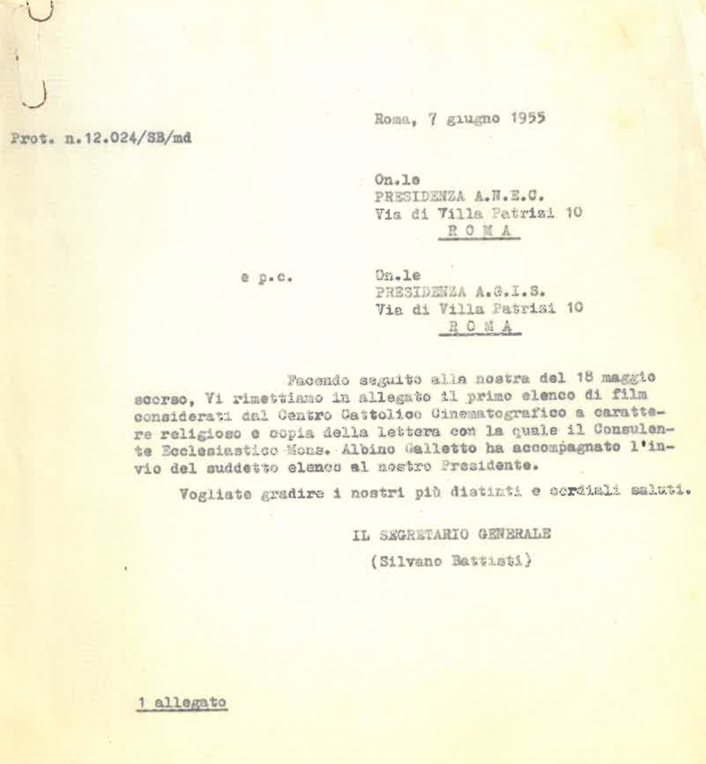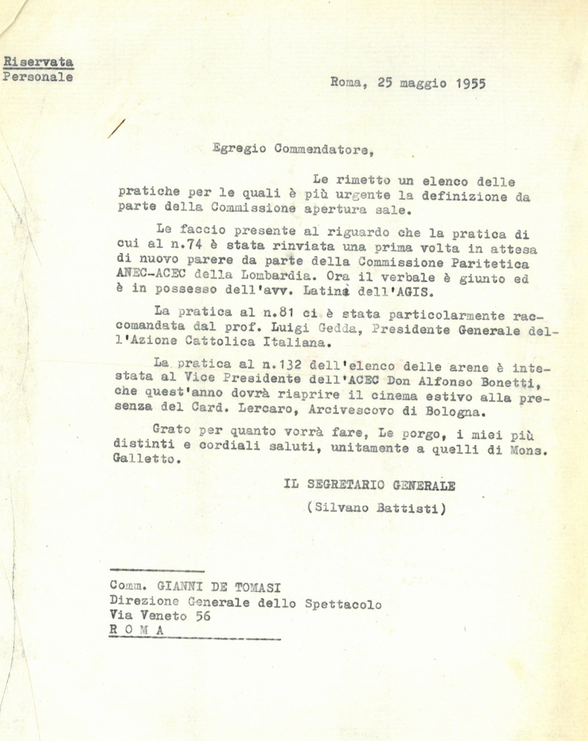 Lettera di Silvano Battisti, segretario generale dell'ACEC, alla presidenza dell'Associazione nazionale esercenti cinema - ANEC