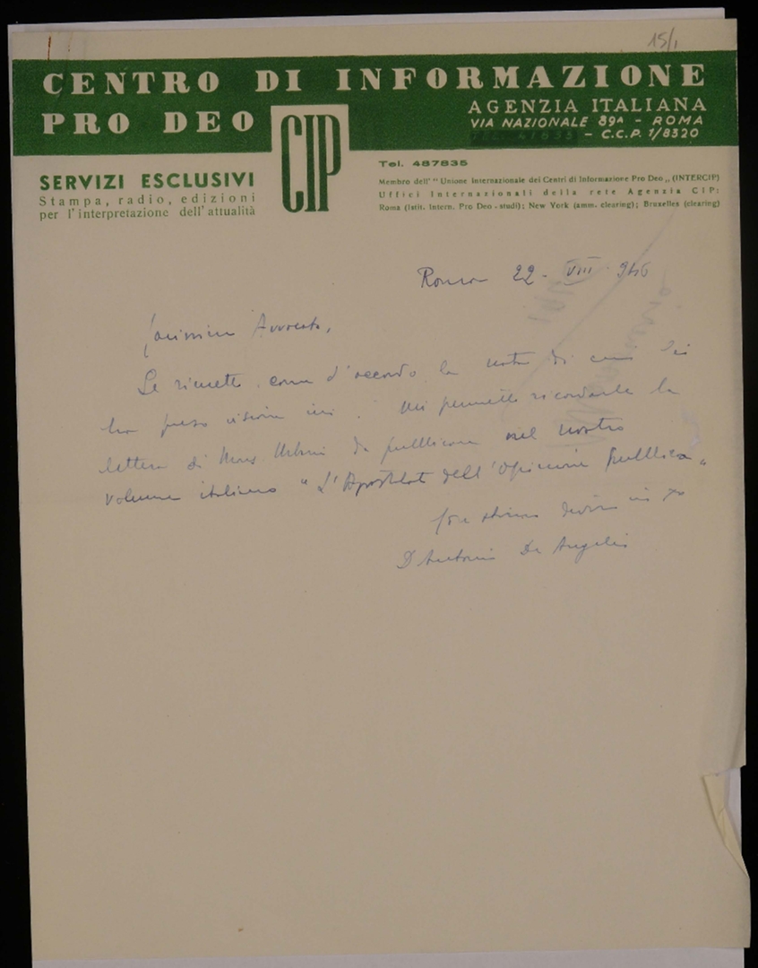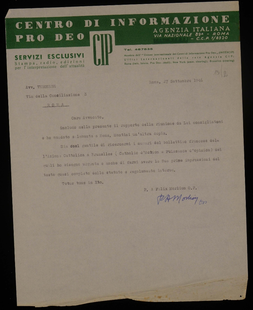 Lettera di padre Félix Morlion, direttore dell'agenzia di stampa cattolica Centro di informazione Pro Deo - CIP, a Vittorino Veronese, presidente generale dell'ACI