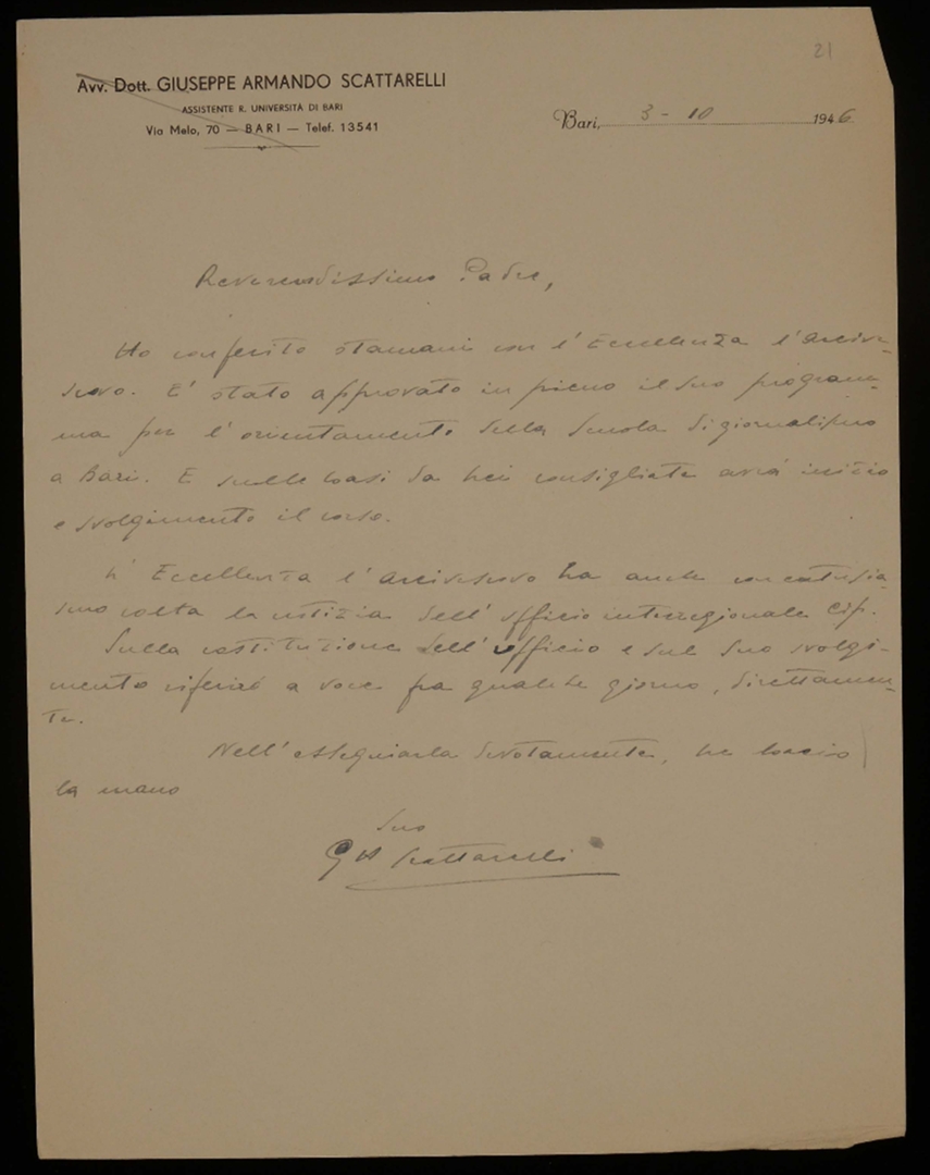 Lettera di Giuseppe Armando Scattarelli a padre Félix Morlion, direttore dell'agenzia di stampa cattolica Centro di informazione Pro Deo - CIP