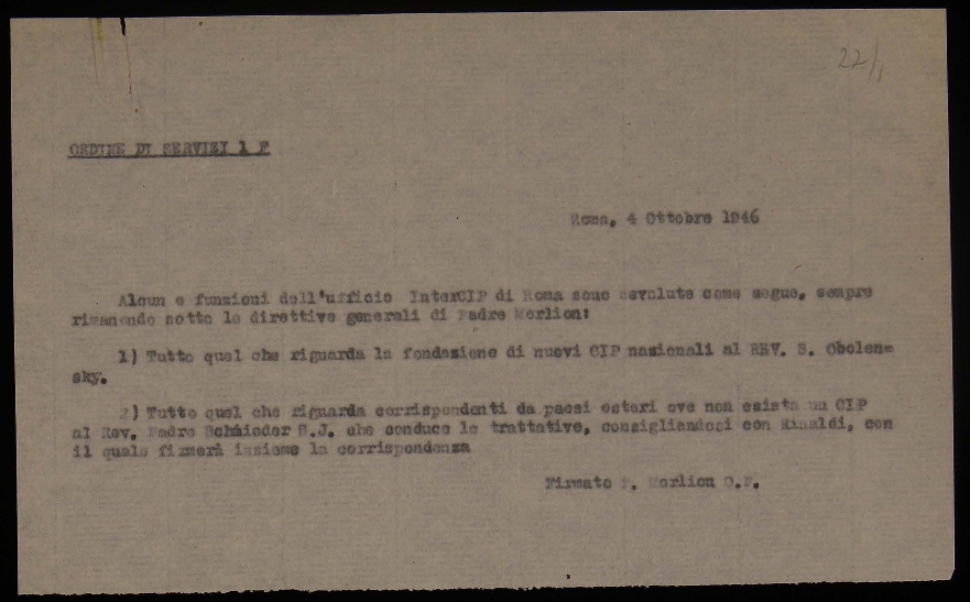 Ordini di servizio del Centro informazioni Pro Deo - CIP, a firma di padre Félix Morlion, direttore dell'agenzia
