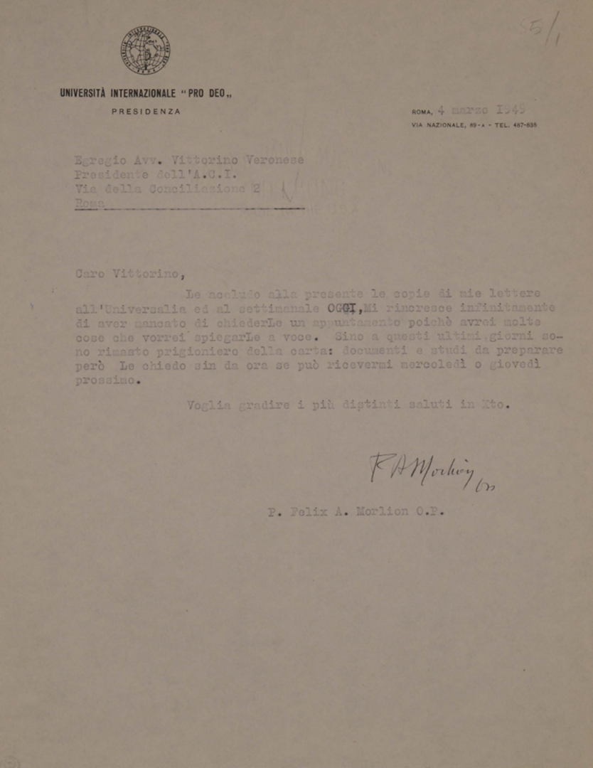 Lettera di padre Félix Morlion, direttore dell'agenzia di stampa cattolica Centro di informazione Pro Deo - CIP, a Vittorino Veronese, presidente generale dell'ACI