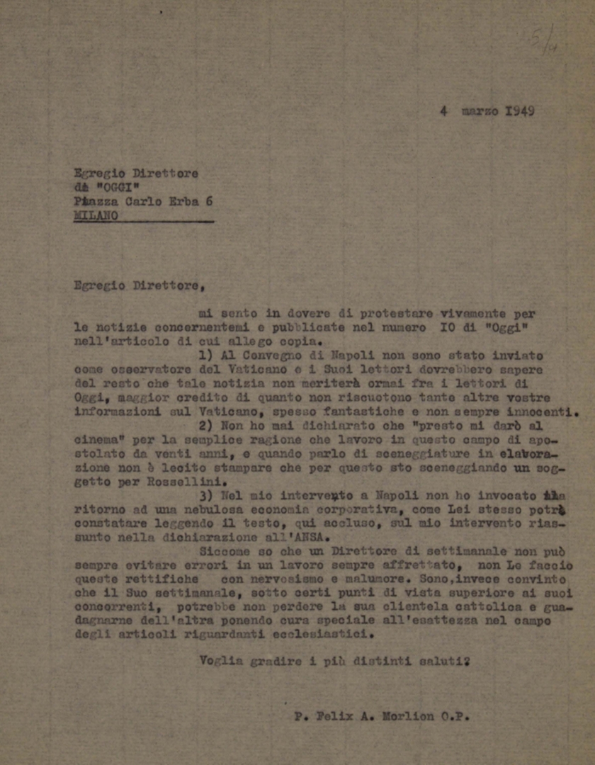 Lettera di padre Félix Morlion, direttore dell'agenzia di stampa cattolica Centro di informazione Pro Deo - CIP, al direttore del periodico "Oggi"
