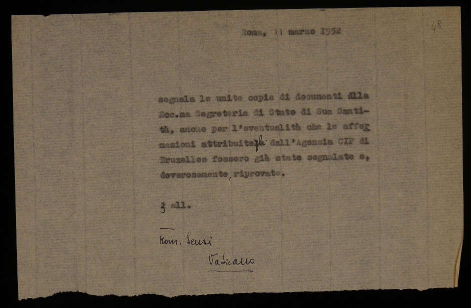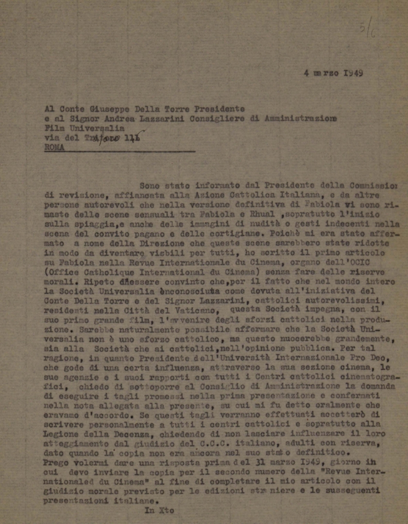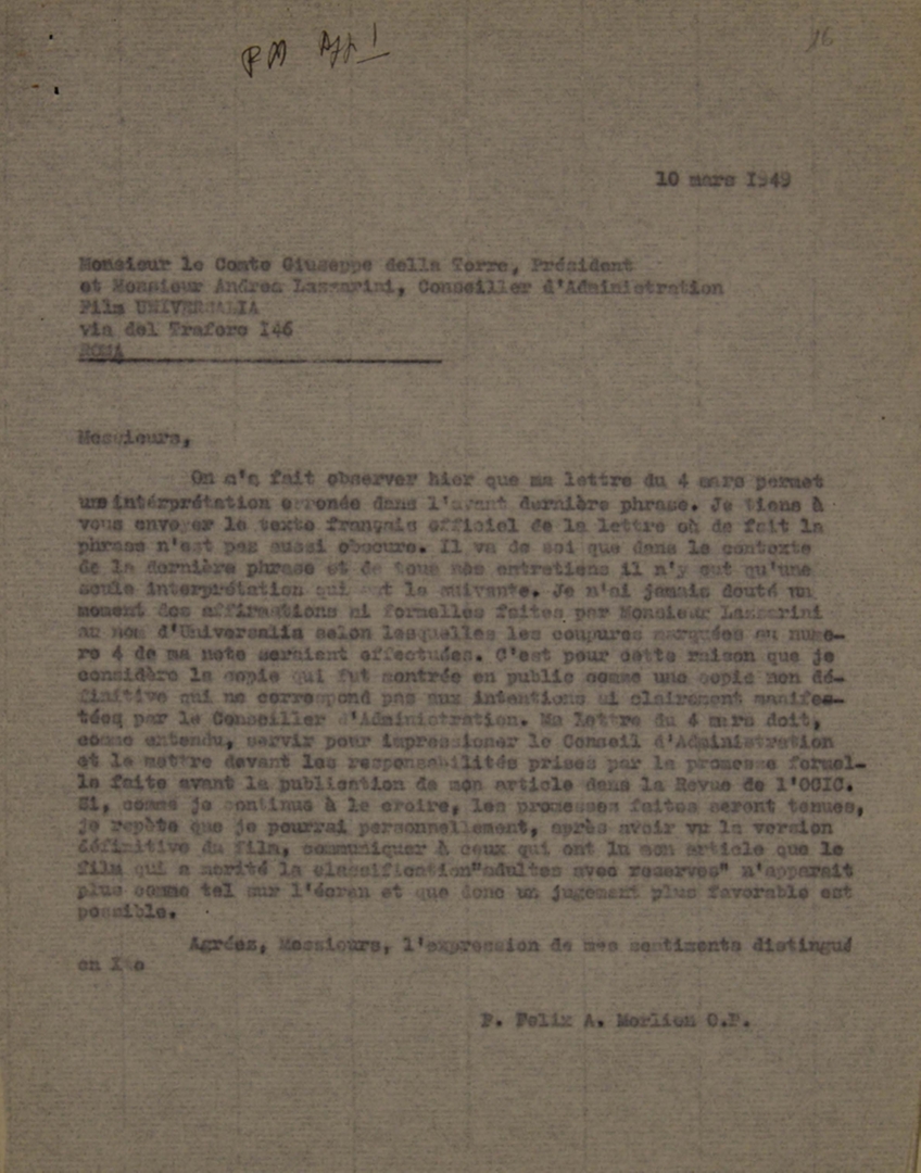 Lettera di padre Félix Morlion, direttore dell'agenzia di stampa cattolica Centro di informazione Pro Deo - CIP, indirizzata a Giuseppe Della Torre e a Andrea Lazzarini, rispettivamente presidente e consigliere di amministrazione della Film Universalia