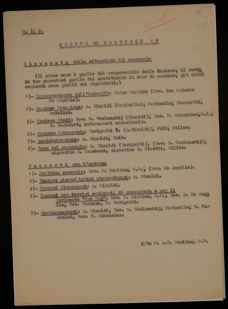 Ordini di servizio a firma di padre Félix Morlion, direttore dell'agenzia di stampa cattolica Centro di informazione Pro Deo - CIP