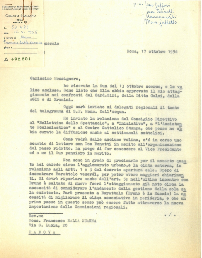 Lettera di Silvano Battisti, segretario generale dell'ACEC, a mons. Francesco Dalla Zuanna, presidente dell'ACEC