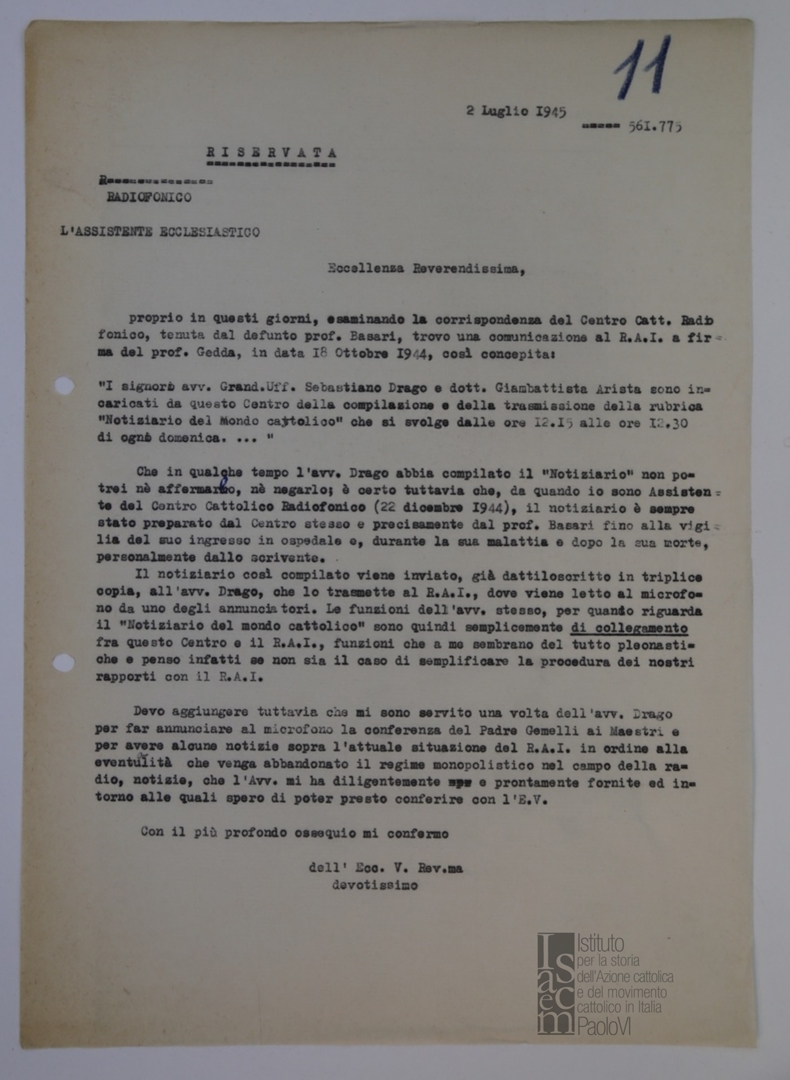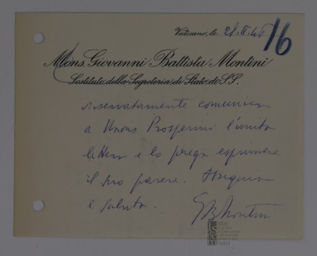 Lettera di mons. Giovanni Battista Montini, sostituto alla segreteria di Stato di Sua Santità, a mons. Ferdinando Prosperini, assistente ecclesiastico del Centro cattolico radiofonico