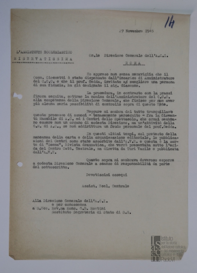 Lettera di Ferdinando Prosperini, assistente ecclesiastico centrale del CCC, alla Direzione generale dell'ACI e per conoscenza a mons. Giovanni Battista Montini, sostituto alla segreteria di Stato di Sua Santità